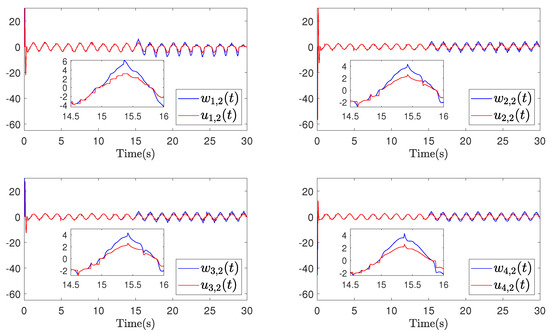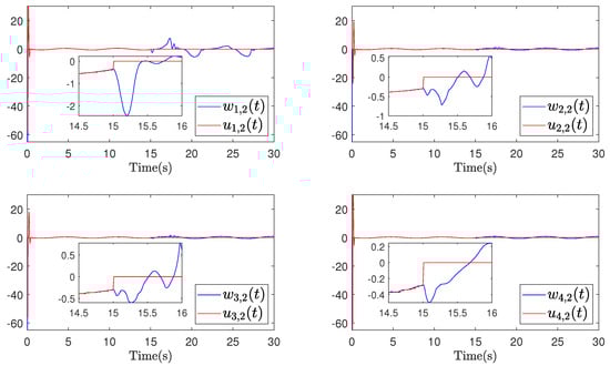 where m/s and kg/s represent the gravitational acceleration and damping factor, m and kg represent the length and mass of the robotic arm, respectively, and J represents the moment of inertia. The system’s constraint functions and the leader’s signal are chosen as , , , and respectively. The other system parameters and controller parameters are listed in Table 4. Similarly, we adopt two types of actuator failure cases from Example 1.