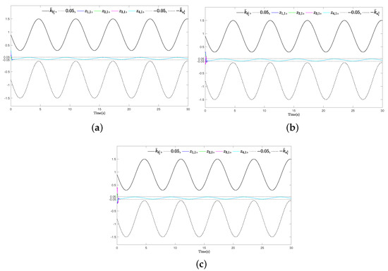 Example 1 (Case I): (a) The synchronization errors of State I; (b) The synchronization errors of State II; (c) The synchronization errors of State III.