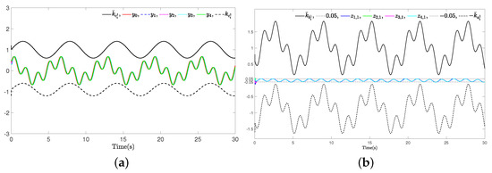 2. According to (49), when , we have . When , due to the boundedness of and , we can conclude that is also bounded. Therefore, there exists a constant such that . Evidently, the occurrence of Zeno-behavior is precluded. □