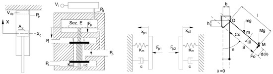 Before proceeding with the construction of the prototype in question, the system was modeled to verify the validity of the design choices, especially regarding the architecture of the control system based on the proportional valve. To this end, modeling of the entire system was carried out. In particular, a fluid dynamic model of the airflow inside the pneumatic cylinder, a model of the proportional valve [50,51,52], and a model of the mechanical system structure were considered. The equations of the three models considered referring to the schemes shown in Figure 2 are shown below with symbols.