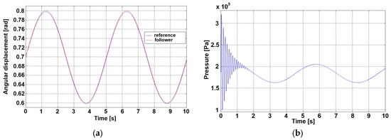 Numerical simulation: trajectory tracking (a), pressure inside the pneumatic cylinder (b).