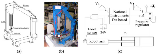 In many areas of human life, it is required to move loads. In the industrial production sector, human strength is often insufficient to move components or assembled items during the assembly stages. Thinking also about other fields, it is evident that the need to carry loads is a widespread task: for example, in agricultural or food production, civil construction or activities in goods’ warehouses, and, additionally, in the biomedical field, there is the problem of assisting the sick and infirm. Patients need to be placed in a sitting position on the bed or, for example, in a wheelchair. The task of moving loads is often complicated by the need to carry out the movement with precision. When it is not required to follow a precise trajectory in space, it may be necessary to position the object on a specific point and with a given orientation. This task is particularly difficult for humans, who can only be accurate with small loads while the accuracy is reduced under stress. On the scientific research front, robotic devices capable of amplifying human strength have been studied for several years and have been proposed either as rehabilitation systems [1,2,3,4,5,6], or as aids [7,8,9,10,11,12], or precisely as the amplifiers of non-disabled people’s strength [13,14,15]. Amplifying human force means the machine can permit the person to always feel the same (however variable) fraction of the external load. From the architectural point of view, these systems can be of various types when contemplating the anthropomorphic arm structure but can experience considerable evolutions up to the possibility of being worn by the operator to constitute real-force-amplifier exoskeletons, soft suite machines, or exoskeleton machines with rigid segments or with elastic elements. The type of actuator can also be a distinctive element: devices with electric [16,17,18,19,20,21,22], hydraulic [23,24,25,26], or pneumatic actuators [27,28,29,30,31,32,33,34] have been proposed. An essential part of the research was also recently dedicated to passive systems [35,36,37,38] that are intrinsically safer, from the point of view of possible malfunctions, but which do not perform as well as the active ones. Interacting with the external environment is an essential aspect of controlling these devices [39,40,41,42,43]. In movements interacting with the environment, the interaction forces must be supported rather than opposed. Lately, the study of human–machine interaction within the Industry 4.0 ecosystem with collaborative robots has received much attention in research. Historically, regarding the human–machine interface, two approaches have been proposed to solve this problem. The first approach controls strength and position without conflict [44,45]. With this approach, the forces are held in contrast to the environmental constraints, while the movements are implemented along the directions in which the manipulator is free to move. The second approach aims to define links between interaction forces and movement [46,47,48,49]. The first approach can be seen as a particular case of the second, which is more efficient than the first and allows manipulations in unknown environments while keeping the forces of interaction with the environment under control. A typical control case operating with this approach is that of impedance control. With this approach, monitoring the interaction force and movement trend is necessary. Therefore, the device is rather complex from the point of view of the control system. This study aims to develop a simple handling system from the point of view of the hardware and control software, exploiting the user’s available skills in manipulating loads that interact with the external environment. A prototype was created to verify the design choices; therefore, the device has kinematics limited to a single motorized degree of freedom. The device looks like an anthropomorphic arm suspended from a frame resting on a base on the ground. With reference to Figure 1, the device has an arm hinged to the shoulder, and a pneumatic cylinder with a 50 mm bore was chosen to carry out the movement.