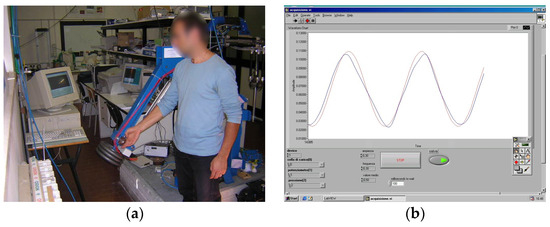 The device during operation (a); comparison between the reference signal (in red) and the trajectory signal carried out by the human–machine system (in blue) relating to a test carried out (b).
