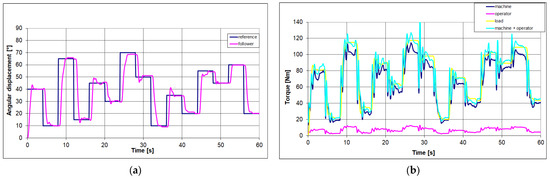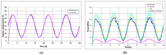 Comparison between the “chased” and “chasing” trends relating to the rotation of the arm (a); trends concerning the torques of the machine, operator, load, and human–machine (b).