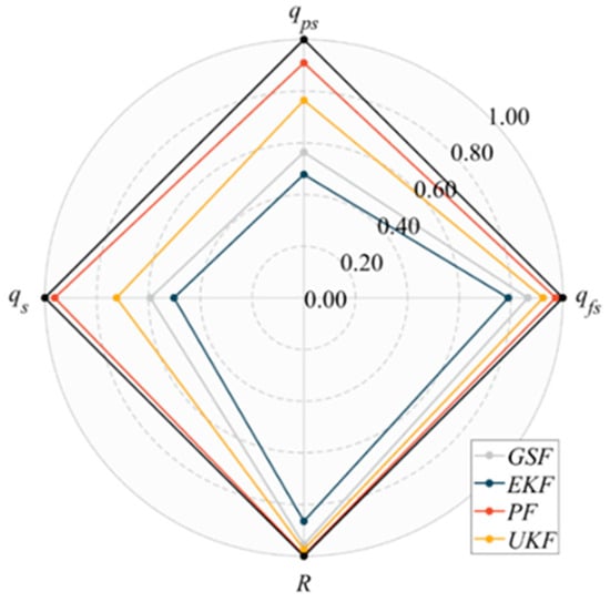 Based on the results in Table 1, radar charts, as illustrated in Figure 3, were generated, with model accuracy results as follows: = 0.553, = 0.433, = 0.921 and = 0.716. The models’ accuracy rankings, from highest to lowest, are PF, UKF, GSF, and EKF, consistent with the findings reported in reference []. The comprehensive evaluation metric “l” aligns with the principles of accuracy assessment in simulation models, allowing for a reasonable and accurate evaluation of the model accuracy. It can be effectively applied to error analysis in hydraulic system simulation models for construction machinery.