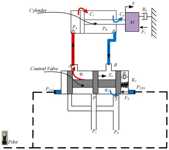 where Ppilot is the pilot pressure, Av is the valve spool cross-sectional area, and F0 is the external force applied to the control valve. The valve spool is primarily subjected to static pressures, such as spring preload, and the impacts of transient fluid dynamics and frictional forces on the control valve were ignored. mv is the mass of the valve spool, Bv is the damping coefficient, Kv is the spring stiffness, xv is the displacement of the valve spool, Cq is the flow rate coefficient, fA is the overflow area, pp is the main pump outlet pressure, pT is the tank pressure, pA is the cylinder large cavity pressure, and pB is the cylinder small cavity pressure.