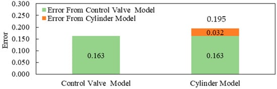 Using the error flow model, variations in the accuracy of the simulation model for the valve-controlled cylinder system can be assessed by calculating the parameter error vectors. For instance, when the subsystem parameter error vectors are and , the errors in various subsystem models within the valve-controlled cylinder system simulation model are illustrated in Figure 8. The error in the control valve model is 0.163, while the error in the valve-controlled cylinder system model is 0.195. The contributions of the errors in the control valve and hydraulic cylinder models to the error in the valve-controlled cylinder system model are 0.163 and 0.032, respectively. Thus, it is essential to focus on the parameters of the control valve model to ensure its accuracy.