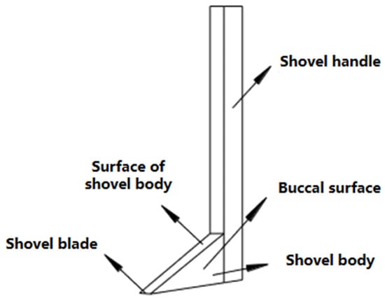 The duckbill ditcher is suitable for wheat flat crop planting patterns with a planting depth of 3 to 5 cm. It provides loose seed bed conditions for crop growth, ensuring that the soil is loose underneath and on both sides of the seed. The duckbill ditcher mainly comprises a shovel body and handle, as shown in Figure 1. The shovel handle is a hollow rectangular tube, matching the width of the shovel body while additionally functioning as a guide for seeds and fertilizers. The shovel body constitutes a crucial opener component, inserting, cutting through the soil, and creating the seed trench. Its construction primarily encompasses the shovel blade, the upper and lower surfaces of the shovel body, and the two cheek surfaces.