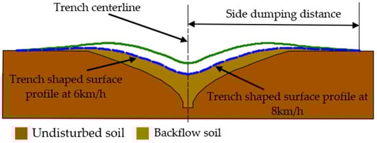 At operating speeds of 6 km/h, 7 km/h, and 8 km/h, the new trencher achieves reductions in the side dumping distances of 2.62%, 2.72%, and 2.43%, respectively, compared to the original trencher. Increasing the operating speed from 6 km/h to 7 km/h results in a 4.58% increase in the side dumping distance for the new trencher and a 4.72% increase for the original trencher. Similarly, the gap between the two side dumpings widens by 3.35% and 3.51%, respectively, as the operating speed escalates from 7 km/h to 8 km/h. Two primary factors can explain the observed phenomenon. Firstly, with the augmentation in trenching depth, the soil disturbance area expands horizontally and vertically, resulting in an amplified momentum of soil disturbance. Therefore, the impact of the shovel body triggers a wider fan-shaped spreading area, ultimately increasing lateral soil throwing distance. Secondly, the trencher’s optimized parameters, characterized by a narrower width than the original and increased soil entry angles, foster enhanced soil fluidity. In conjunction with the reduced soil rising along the upper surface of the shovel body and alleviating soil blockage in the front of the shovel body, this results in a relatively decreased volume of impacted soil. Consequently, this reduces lateral soil throwing distance and minimizes soil disturbance.