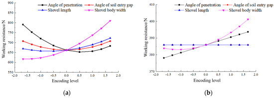 As shown in Figure 6, our observations reveal that, for the angle of penetration values below the 0.6 horizontal, the resistance response exhibits a negative correlation with the angle of penetration, indicating a substantial disturbance on the indicator. Conversely, when the angle of penetration surpasses 0.6, the resistance response displays a positive correlation with a relatively minor disturbance. The angle of penetration demonstrates linear variation to the side dumping distance—greater angles correspond to increased side dumping distances. Shovel body width positively correlates with resistance response, with disturbance amplifying as the coding level rises. Soil disturbance response varying correlation relationship with shovel body width (confined within −1.13 levels). In contrast, the shovel body length and soil entry gap angle into the soil minimally disturbs the side dumping distance. Simultaneously, the working resistance exhibits a positive correlation with the shovel body length, whereas the angle of soil entry gap into the soil reveals both negative and positive correlations (restricted by the 0.1 level). The disturbance alteration remains comparatively slight. Despite the minimal disruption to indicators near coding levels of 0.6, −1.56, and −1.13, the penetration angle and shovel body width emerge as prominent disturbance sources across the entire coding level spectrum. The primary and secondary influence orders of these factors on indicators cannot be conclusively determined.