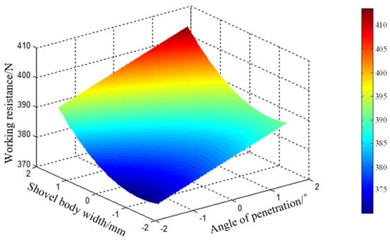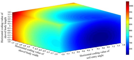 We select three significant factors in the order of influence based on the regression model obtained above. Subsequently, a four-dimensional slice chart is employed to depict these factors’ effects on work resistance visually. Figure 7 illustrates the impact of penetration angle, shovel body width, and shovel length on the working resistance. The horizontal value aligned with the darker blue region represents the configuration of trencher structural parameters during the diminished working resistance.