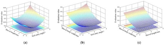 Response surface of evaluation value. (a) Response surface of soil entry angle and shovel length; (b) response surface of soil entry angle and shovel body width; (c) response surface of shovel length and shovel body width.