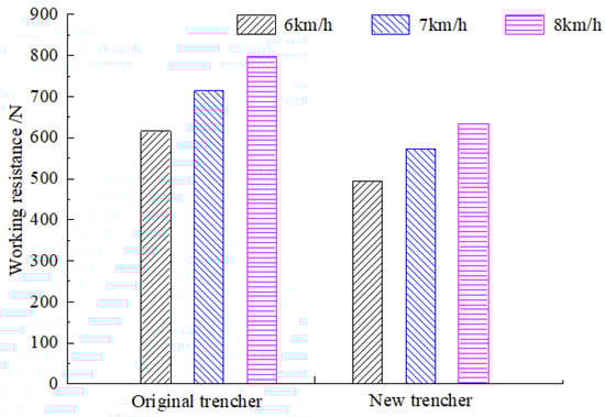 As shown in Figure 10. Experiments were conducted at a depth of 5 cm and operating speeds of 6 km/h, 7 km/h, and 8 km/h using both the original trencher and the optimized new trencher. The working resistance outcomes of the two sets of trenchers under diverse operating speeds were obtained through a data collection and transmission system.