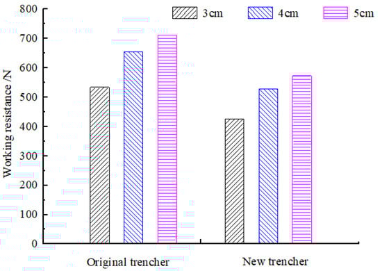 As shown in Figure 11, we conducted trenching tests with two sets of trenchers at a working speed of 7 km/h and depths of 3 cm, 4 cm, and 5 cm, acquiring the working resistance outcomes of the trenchers at varying depths.