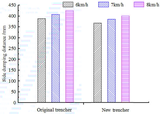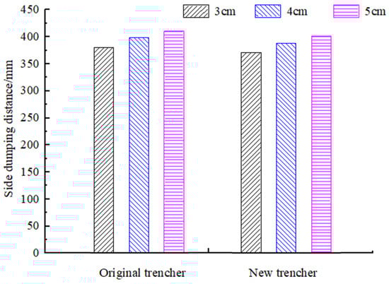 At operating speeds of 6 km/h, 7 km/h, and 8 km/h, the new trencher reduces side dumping distance by 5.4%, 5.64%, and 5.87%, respectively, compared to the original trencher. Elevating the operating speed from 6 km/h to 7 km/h augments the side dumping distance by 4.62% and 4.88% for the new and original trenchers, respectively. Similarly, when the operating speed increases from 7 km/h to 8 km/h, the gap between the two side dumpings expands by 4.16% and 4.41%, respectively. Multiple factors can illustrate this phenomenon. Firstly, the increased operating speed intensifies the shovel’s impact on the soil, expanding the fan-shaped area and augmenting the side dumping distance. Additionally, the new trencher boasts a narrower width than the original trencher and has an increased penetration angle, promoting soil fluidity and mitigating soil blockage in front of the shovel body. Therefore, there is a relative decrease in the volume of impacted soil, reducing lateral soil throwing distance and mitigating soil disturbance.