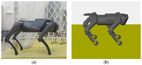 Cyber Dog quadruped robot: (a) Cyber Dog quadrupedal robot prototype; (b) Cyber Dog quadruped robot simulation model.