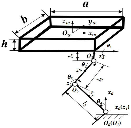 When the leg mechanism is in the support phase, there is no side swing motion; therefore, the θ1 of the side swing joints is constant at zero. The spatial coordinate system of each joint of the leg in this phase is shown in Figure 3. The θ2, θ3, and θ4 denote the joint angles of the shoulder, knee, and ankle joints, respectively. In addition, the D–H parameters of the supported phase are shown in Table 2.