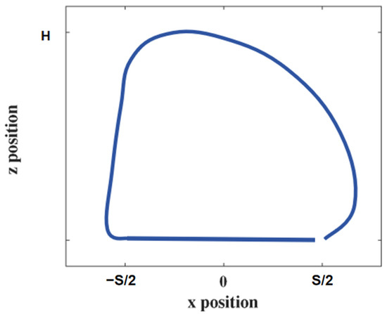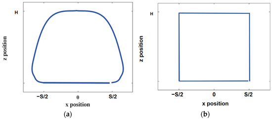 A well-designed foot-end trajectory can reduce joint moments and angular acceleration, reduce energy consumption, and increase the energy consumption rate. The composite pendulums and linear foot trajectories, commonly used foot trajectories, and the end-of-foot trajectory of a robot walking one step read by the Simulink oscilloscope module, as shown in Figure 4, were compared with the trajectories obtained from subsequent simulations of energy consumption. The gait parameters considered were S = 0.2 m, T = 0.8 s, and H = 0.15 m, which represent the displacement of the robot’s X-axis walking in one gait cycle, the gait period, and the maximum height of the robot’s foot lift in the Z-axis direction, respectively. In this paper, the side swing motion of the leg mechanism of the quadruped robot was not explored, so the motion of the foot end in the y-axis direction was not considered.
