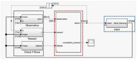 Simulink reinforcement learning flowchart. The black box is the module of the environment state and reward function observed by the RL Agent, the red box is the module of the RL Agent, and the blue box is the module of the environment, i.e., the quadruped robot system simulated in this paper.