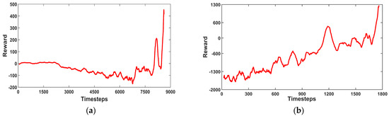 Reinforcement learning reward function curves: (a) reward function curve in the first stage; (b) reward function curve in the second stage. The range of values of rt is .