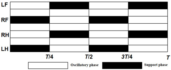 The kinematic inverse Equations (3) and (6) were implemented within the Simulink function module by Matlab. Then, the spatial position coordinates x, y, and z of the three foot-end trajectories were imported into the simulation system for simulation. An oscilloscope was connected to the joints to record the joint moments and angular velocities, and the difference in energy consumption between the simulated foot-end trajectories and the above trajectories at the same period and velocity can be calculated using Equation (7). For the control of the position and pose of the robot, PID control was used, and the control was built using Simulink in Matlab, as shown in Figure 8. The gait planning in the PID control used a diagonal gait, as shown in Figure 9, where the left front leg, right front leg, right hind leg, and left hind leg of the robot are divided and denoted by LF, RF, RH, and LH; the white squares represent the lifting of the leg in the swing phase, and the black squares represent the landing of the leg in the support phase, where T is the gait period, which was set to 0.8 s in this experiment. The equation for the relationship between the body velocity v and the step length S and the foot-end period Tm is as follows: , where Tm is the period of 0.2 s for one step of foot-end walking.