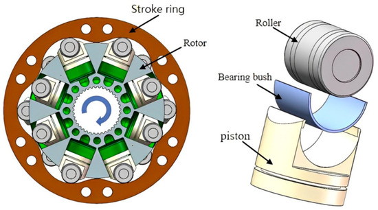 Hydraulic drive plays an important role in modern industry [1,2,3]. The multiple-stroke piston motor has the characteristic of high output torque at low speed and is widely used in military, engineering machinery, shipbuilding, and other industries [4,5,6]. Its typical structure is shown in Figure 1. When the bottom of the piston is forced by high-pressure oil, the roller is pressed on the inner surface of the stroke ring, and a reaction force is provided by the stroke ring. The tangential component of the force rotates the rotor, and the hydraulic energy converts to mechanical energy. During the movement process, the stroke ring, as a core component of the multiple-stroke piston motor [7,8], determines the motion characteristics of the piston assembly and affects the output characteristics of the motor. Therefore, many scholars have conducted research on optimizing the ring curve.