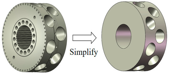 Step 1: Simplify the 3D model. Chamfers, rounded corners, hole slots, etc., were removed. The comparison before and after simplification is shown in Figure 3. Its purpose is to avoid stress singularity and improve work efficiency. Meanwhile, the focus of this study is on the deformation of the stroke ring, and the impact of removed chamfers and other features on the research content can be ignored.