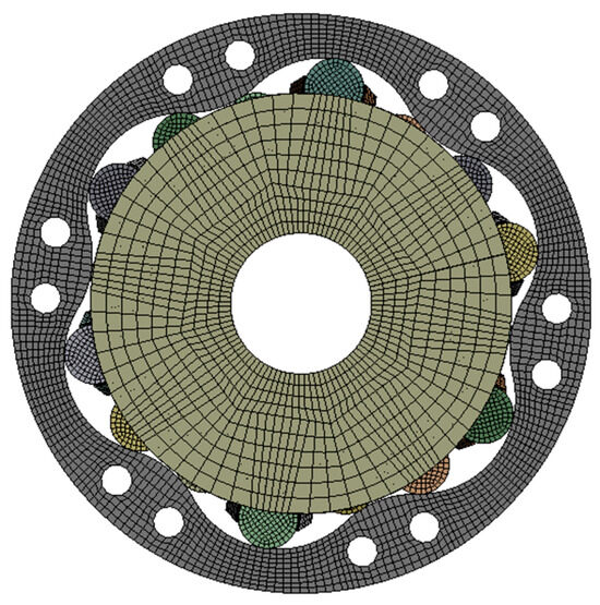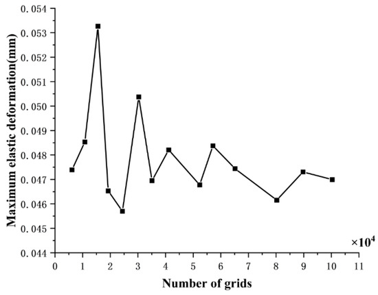 Step 9: Perform mesh independence verification. Considering the simulation efficiency and periodic characteristics of the motor piston, a single-piston model was used to obtain a reasonable number of grids. The maximum deformation of the stroke ring was used as a characterization parameter to simulate, and the mesh refinement process is mainly aimed at the rollers and the stoke ring. The simulation results are shown in Figure 5; when the number of meshes exceeds 35,000, the maximum deformation of the stroke ring begins to fluctuate steadily, with a fluctuation error of less than 4.66%. Taking into account simulation quality and efficiency, a mesh partitioning method of approximately 41,000 meshes was used as an example to partition the multi piston model. The final mesh division result consists of 353,310 meshes, with an average grid quality of 0.8127.