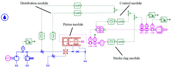 Through the motor structure parameters, a single-piston hydraulic model was established in AMESim [26], as shown in Figure 6. The model consists of a distribution module, a piston module, a stroke ring module, and a control module. The distribution module simulates the fluid distribution process of the valve plate by controlling the opening area of the throttle valve to realize the change of the flow area of the valve plate. The piston module simulates the trajectory of the motor piston, the volume change of the piston chamber, the leakage between the piston and the roller, and the leakage between the piston and the rotor piston chamber. The stroke ring module describes the stroke ring profile by inputting the curve function, so that the movement of the piston can be limited. The control module feedback the rotation angle of the motor through the angle sensor to control the opening area of the throttle valve and the motion characteristics of the piston and form a feedback loop. Finally, the torque output of the motor is obtained by multiplying the force acting on the piston by the degree velocity of the piston through the rotary–linear modulated transformer.