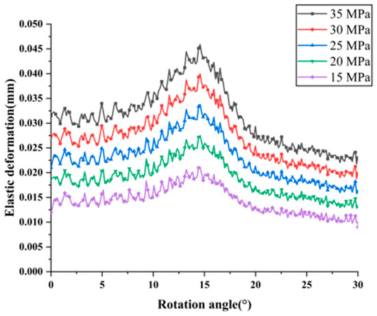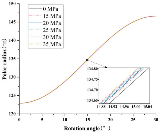 Figure 8 shows that in the high-pressure region (0–30°), as the rotor rotates, the elastic deformation of the stroke ring shows a trend of first increasing and then decreasing, and the rate of change of elastic deformation varies in different angle ranges. This phenomenon can be explained by Equation (11), where the reaction force and the curvature radius of the stroke ring are related to its deformation and vary with the rotation angle. Meanwhile, as the load pressure increases, the deformation at each point of the stroke ring also increases, but its overall trend of change is consistent. Among them, the main factors affecting elastic deformation are the load pressure of the motor, the pressure angle of the stroke ring, and the curvature radius.