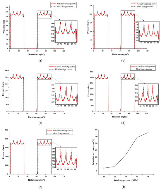 Pressure comparison diagram of piston chamber before and after deformation of ideal design curve under different pressures: (a) 15 MPa; (b) 20 MPa; (c) 25 MPa; (d) 30 MPa; (e) 35 MPa; (f) pressure pulsation increase rate.
