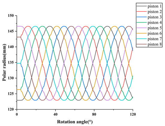 In order to analyze where the maximum pulsation of the motor occurs, the piston displacement motion curve needs to be obtained, as shown in Figure 12. Since the motor can be divided into two groups of equivalent pistons according to the phase angle, only eight pistons need to be simulated for the analysis.