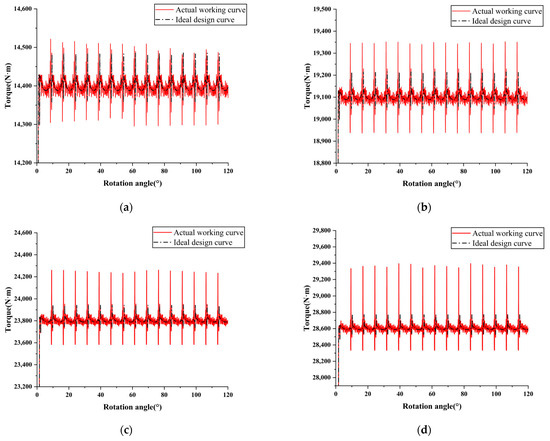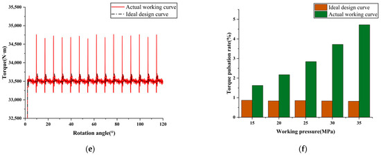 As shown in Figure 15, although there is a large gap between the compensating design curve and the ideal design curve when working without pressure, the actual working curve can be close to the ideal curve after the deformation of the high-pressure load. The deviation of the operating curve from the ideal curve at different pressures in different areas of the curve is not the same, and it is due to the nonlinear deformation of the curve and the discrete deviation of the fitted curve. Combined with the variation in the movement characteristics of the piston in different areas, the different distribution of this deviation further affects the output characteristics of the motor. The torque pulsation rate therefore needs to be further analyzed to verify the reasonableness of the curve.