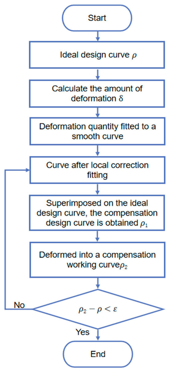 The optimization process is as follows: Firstly, the finite element simulation of the ideal design curve is carried out to obtain the deformation value and fit it into a smooth curve, then the fitted curve is locally corrected. Secondly, the locally corrected fitted deformation value curve is superimposed on the theoretical design curve to obtain the compensation design curve . Thirdly, introduce the curve after deformation compensation into finite element software for deformation calculation, and obtain the actual working curve . Finally, if the condition is met, , then output the compensation design curve . Otherwise, continue iterative correction.