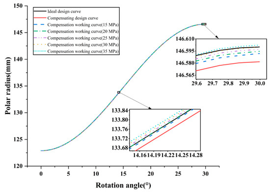 Due to the requirements of the main machine system, the iterative design of the motor stator guide curve is optimized at 25 MPa and 1 r/min operating conditions. The compensation design curve is imported into the simulation model to investigate its deformation and output characteristics at different load pressures. The compensation design curves and their deformation operating curves at different pressures are shown in Figure 15.
