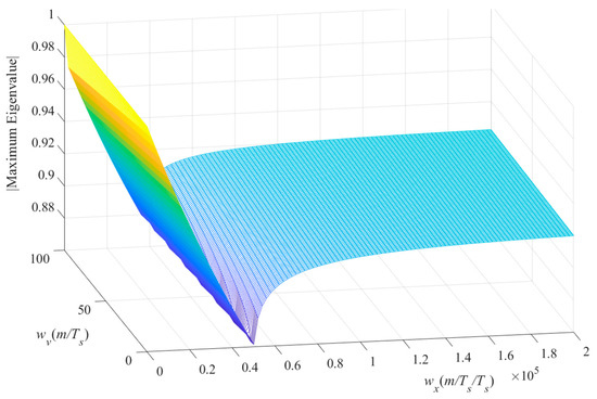 It is difficult to solve the eigenvalue of A − BKM analytically. Therefore, we calculate the maximum eigenvalue numerically by selecting the weights within a certain range. Set , , and , the norm of the maximum eigenvalue is plotted in Figure 2 by from 1 to , and from 1 to . The system parameters are set as the values from the test bench introduced in Section 4.