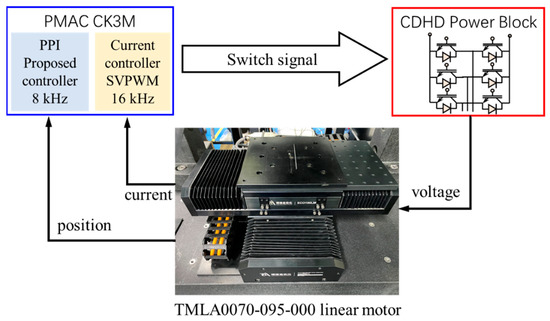 In the test bench, the linear motor was controlled by a PMAC controller with the type of CK3M from OMRON. The motor was driven by a Power Block from CDHD through the Pulse Width Modulation (PWM) signals. The current controller and PWM algorithm were implemented in CK3M with a control frequency of 16 kHz. The power block received only the switch signals for the inverter, whose frequency was the same as the current control frequency 16 kHz. The current controller applied in CK3M was a PI controller (). After the auto-tuning, the control gains were parameterized as . The bandwidth of the closed current loop was over 1 kHz.