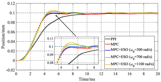 The setup response is applied to test the tracking performance when the position commends stepwise changes from the initial position of 0 mm to 0.1 mm. For P-PI control, the MPC and MPC + ESO with different poles, the experimental results are shown and compared in Figure 4.