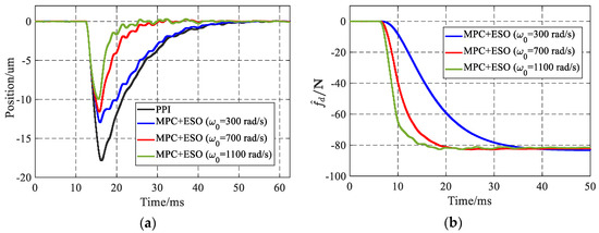 Generally, the proposed control method shows a better disturbance rejection than the PPI control. The ESOs with different poles estimate disturbance current as the lumped disturbance and converge value of 83 N. The higher the cutoff frequency is set, the quicker the ESO output converges. Consequently, both the maximal position error and settling time decrease with the increase in the cut-off frequency. The results of different control methods are listed in Table 3 for a better comparison. Compared with the ESO with the cutoff frequency of 300 rad/s, the ESO with the cut-off frequency of 700 rad/s shows a significant enhancement of the disturbance performance with the improvement of the maximal error and the settling time of 17.8 μm and 35.7 ms from PPI to 11.6 μm and 18.1 ms, respectively. For the further increase in the cut-off frequency, the anti-disturbance performance is still improved but with a limited decline from 11.6 μm and 18.1 ms to 10.0 μm and 12.8 ms, respectively.