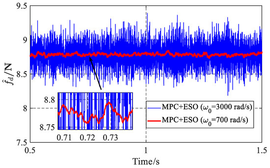 Considering the noise in the feedback signal, the cutoff frequency of the ESO cannot be set with an excessively high value. Figure 6 shows the effect of the noise with different pole places on the estimation output when the motor is in the steady state of 0 mm command position. When the pole of the ESO is located at −700 rad/s, the jitter of the estimated disturbance is about 0.05 N, but when it is increased to −3000 rad/s, the jitter increases significantly to about 1 N. The trend matches the theoretical analysis of Equation (22).