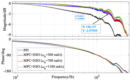 As mentioned above, the frequency response for the position tracking is mainly dominated by the MPC, but the cut-off frequency of the observer has a certain impact on it. Increasing the cut-off frequency from 300 to 700, the property of magnitude in the middle-frequency range of about 40 Hz will be better with less attenuation, which means less transfer distortion in this frequency range. But when further increasing the cut-off frequency, a peak at about 135 Hz will be obvious. This is mainly caused by the amplify effect of the ESO on the measurement noise, as shown in Figure 7 green, and will damage the stable reverse. Therefore, choosing a suitable cut-off frequency of the ESO is relevant for industrial applications.