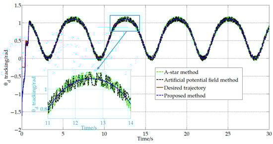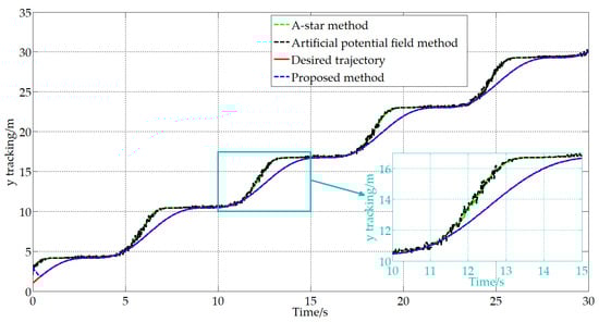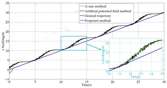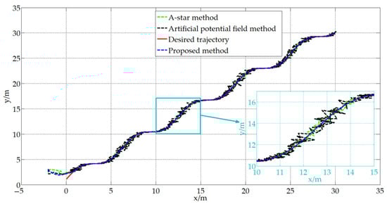 To further verify the effectiveness and feasibility of the proposed method compared to the existing methods, we introduce the A-star method and artificial potential field method. The trajectory tracking results obtained are shown in Figure 10, Figure 11, Figure 12 and Figure 13.