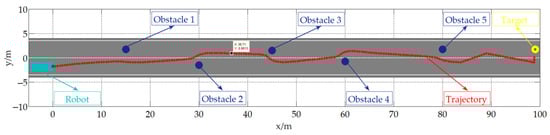 Firstly, five obstacle points and one target point were set, and simulation verification was conducted in MATLAB based on the proposed control method to verify the ability of trajectory planning and autonomous obstacle avoidance in the scenarios without certain trajectories and with multiple obstacles. The simulation result is shown in Figure 15.