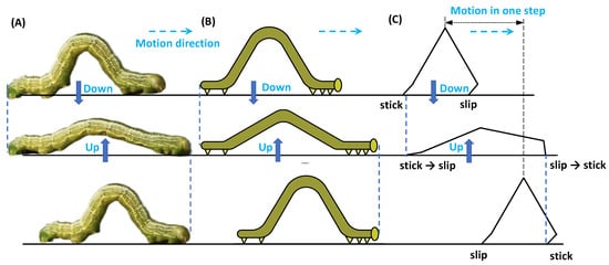 Bio-inspiration from inchworm crawling: (A) motion of a real inchworm; (B) equivalent visualization; and (C) simplified modeling.