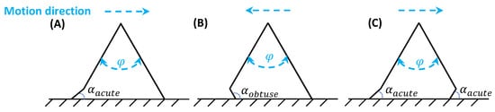 Motion direction of the robot when bending the extremities with different attack angles ( is the actuated joint’s angle): (A) rear segment with acute angle; (B) front segment with obtuse angle; and (C) both segments with acute angles.