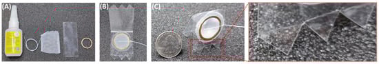 The prototyping process: (A) materials required for the prototype (from the left: glue, flexible tube, latex sheet, PVC board, and paper ring); (B) gluing stage to secure one side of the latex sheet on the PVC board; (C) final shape of the robot with detailed view of an extremity in the red box.