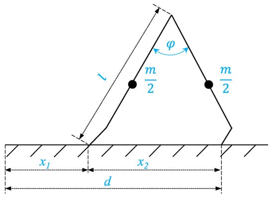 The inverse V-shape structure proposed in Section 2.1 is the reference for our multistate model with stick–slip contact conversions, where one extremity sticks while the other slips. Although the serrated edge extremities of the robot have a certain amount of bending with respect to the main segments going to the robot joint, this micro-motion has minimal effect on the whole geometry, as experimentally observed. Thus, the two-bar simplification shown in Figure 6 holds, where L = 40 mm is the length of each segment and m/2 = 0.7 g represents the mass located at about half length (we also include the actuator mass in this term since it is extremely low, as elucidated in Table 1). The robot actuation is controlled by the time-varying torque applied to the joint, whose angle is: