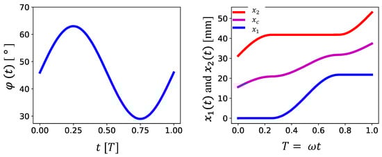 where the amplitude A and frequency ω depend on the input given to the electro-pneumatic power supply, and the average phase delay γ is related to the dynamics of the fluid-driven subsystem. The horizontal distance separating the two contact points with the ground results as follows: