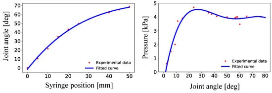 Experimental relationship between the syringe position and the joint angle of the robot (left-hand side) and between the joint angle and the actuator pressure (right-hand side).
