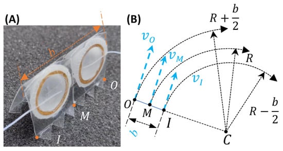 Our emphasis is now on modeling the robot trajectories when cornering, so the dual-actuator version is shown in Figure 9 with indications of crucial parameters. The key points of this robot are the outermost, middle, and innermost. If the two actuators are inflated/deflated differently, the robot will turn accordingly due to the rigid connections of the two halves.